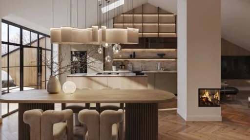 Bostaden utrustas med ett exklusivt kök från Poliform samt genomgående högkvalitativa och noggrant utvalda materialval, där modern komfort möter tidlös elegans.
