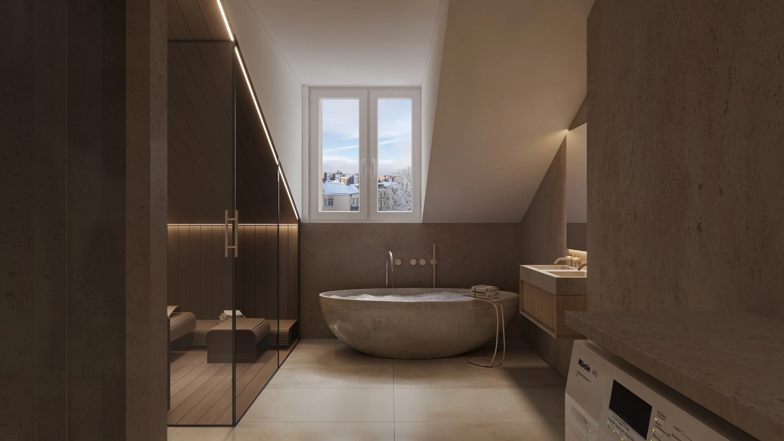 Projektet omfattar en vind om cirka 140 kvadratmeter som har omvandlats till en unik penthouse-lösning med en bostad. Lägenheten disponeras generöst och erbjuder två stora altaner som skapar en sömlös övergång mellan inne och ute.