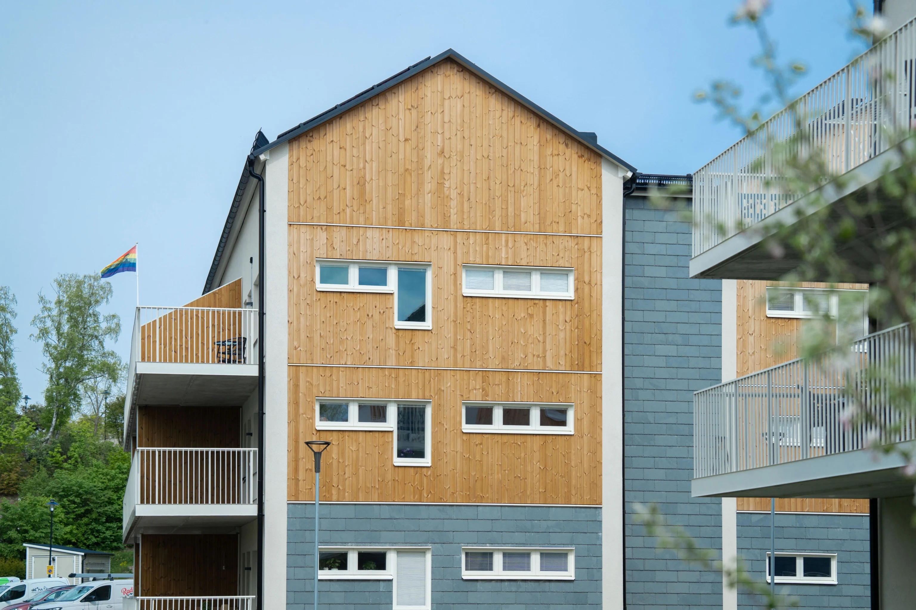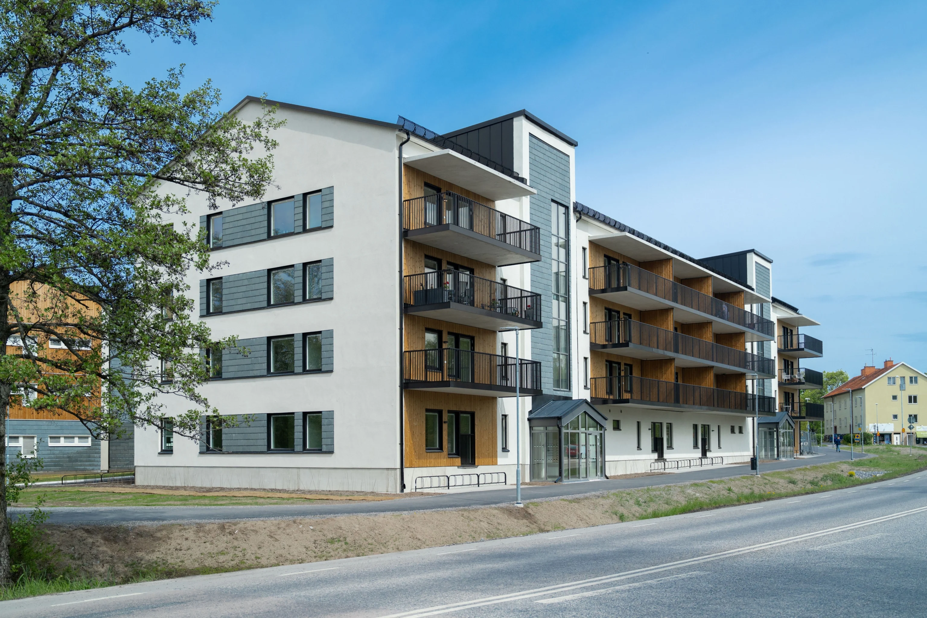 Lägenheterna fördelas mellan tre huskroppar- ett lamellhus och två punkthus. Lamellhuset innehåller 51 st lägenheter. Huskroppen består av fyra våningar bostäder + vindsförråd. På bottenvåningen finns utöver bostäder även soprum och rullstolsförråd som båda är tillgängliga inifrån huset.